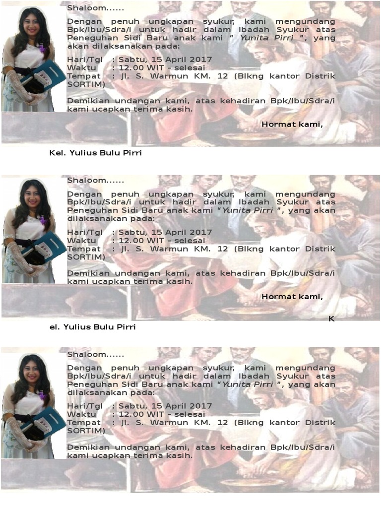 Undangan Yuni from imgv2-1-f.scribdassets.com Sebab allah setia dan karena itu ia tidak akan membiarkan kamu dicobai melampaui kekuatanmu. Baptisan usia dewasa dilayankan bersama peneguhan sidi. Setelah melakukan katekisasi, seseorang bisa diteguhkan melalu peneguhan sidi oleh pendeta jemaat melalui upacara liturgi di hadapan sidang jemaat. Tatkala menghadiri sebuah acara adat yang dilaksanakan orang batak di jakarta, karena anak tuan rumah baru dilantik menjadi anggota sidi jemaat. Jun 09, 2006 · peneguhan sidi diberikan kepada seseorang yang pada waktu kecil sudah menerima sakramen baptis kudus anak/ bayi. Saya pribadi bingung kenapa saya mendapat ayat pegangan saat peneguhan sidi seperti ini : Dalam gereja toraja sendiri, sidi adalah hal yang wajib bagi anggota jemaat yang sudah katekisasi. Lebih baik orangtua atau anggota keluarga tidak menghadiri percakapan ini, karena mungkin saja dapat mengganggu kebebasan calon sidi.